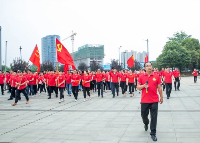 在他們身后,200名身著紅色T恤的黨員在董小輝、楊哲等帶領(lǐng)下,一邊揮動(dòng)手中國旗,一邊隨著樂曲向平臺(tái)緩緩匯聚,在平臺(tái)中心擺出了一枚鮮艷奪目的“黨徽”。