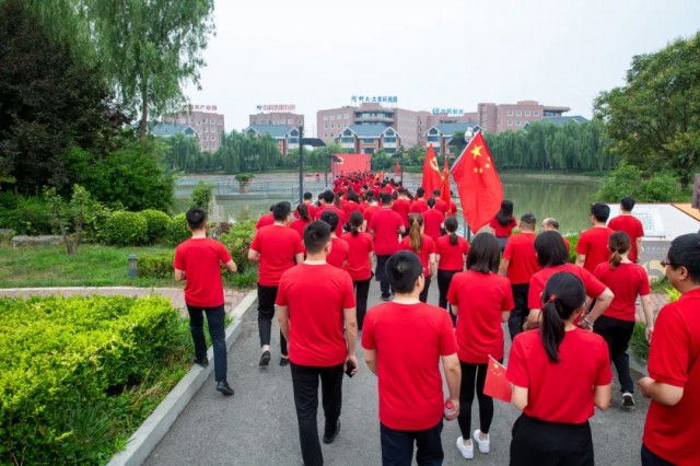蔚藍(lán)的天空下,闊大的中心湖平臺(tái)上,一面鮮艷的黨旗高高聳立。兩名旗手高舉黨旗和國旗,沿著炎黃科技園黨建長廊向平臺(tái)飛奔而來。